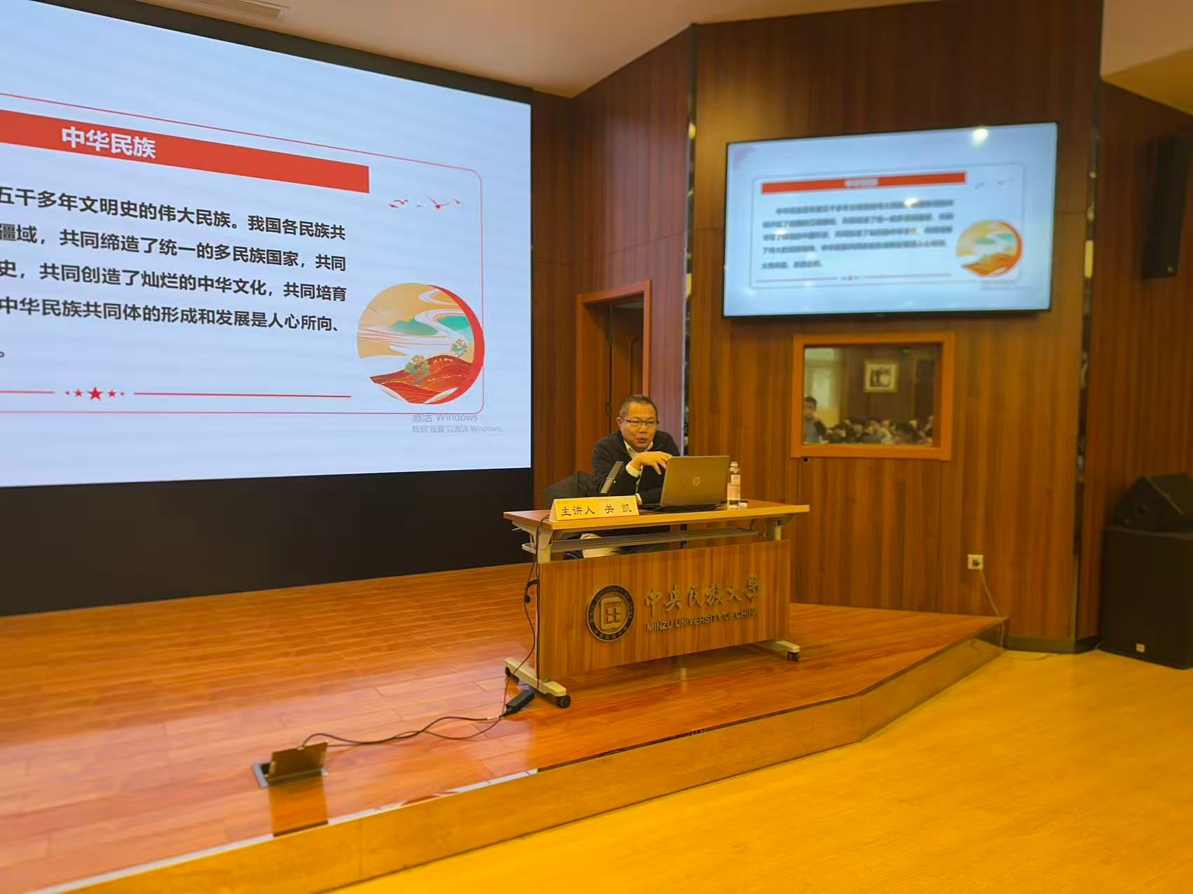 在历史部分,关老师谈到,习近平总书记关于加强和改进民族工作的重要思想,内容十分丰富,涉及民族工作各领域各方面,是一个完整的思想体系,概括起来主要是“十二个必须”,关老师重点指出,铸牢中华民族共同体意识最重要的文化面向之一,就是树立正确的中华民族历史观。中华文明“天下体系”中长期发生的不同人群、不同政权、不同社会系统之间的持续互动,塑造出自在的中华民族共同体意识。近代以来,面对现代性的挑战,中华文明实现自我更新,接续传统并融通现代性,中华民族从自在走向自觉,并由自觉生成新的中华民族共同体意识。关老师引用《史记》里的经典,指出,公私分明是中华文明是区别于其它文明的重要标志,并就以黑格尔为代表的西方中心主义历史观进行了批判,分析了自我中心的错觉,东方不变论的错觉,以及进步是沿着一根直线发展的错觉,单线交换路的错觉等历史观错觉的观点。西方中心论是以西方文明为基准的历史观和世界观,主张西方社会发展模式具有普适性,否定非西方文明的独立价值,常被视为欧洲中心论的延伸。该理论以种族论、文明优越论为基础,通过“冲击—回应”“传统—近代”等框架解释非西方历史,构建以西方现代化道路为唯一范式的逻辑闭环,并以“天赋人权”“理性标准”等话语体系强化其意识形态内核,现代演化出文明冲突论、普世主义价值论及殖民主义式文化输出等表现形式。因此,我们要反观自身的知识构建,立足中华民族悠久历史,加强中华民族共同体理论体系建设。